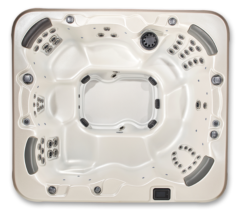 Measuring 82" x 92", the Alpine features a full-length no-float lounger and three uniquely designed captain’s chairs, each set at a different height with customized jet patterns to target the back and shoulders. The spacious footwell comfortably fits up to seven sets of feet and offers enough room to stretch, unwind, or move freely in warm, therapeutic water.